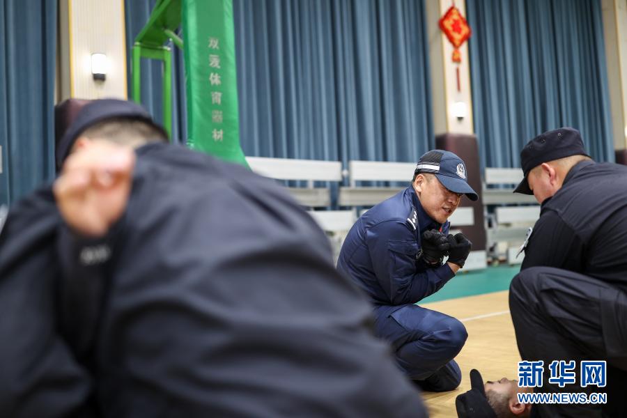11月24日,青海省公安厅教官团教练刘斌在为西宁监狱干警做徒手攻防与控制动作指导。