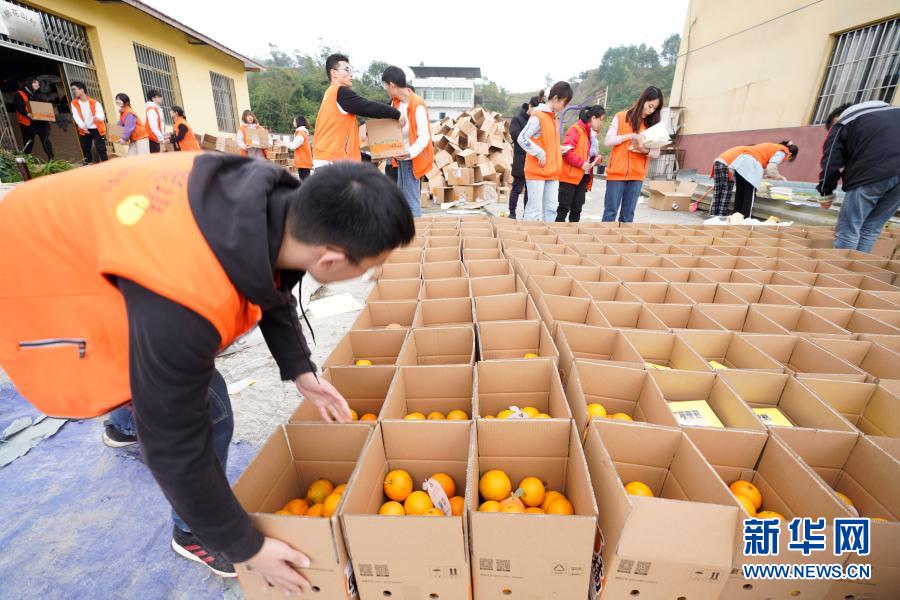 11月29日,在重庆市北碚区东阳街道桃花山村,志愿者将柑橘装箱,准备外运。