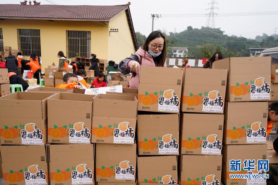 11月29日,在重庆市北碚区东阳街道桃花山村,志愿者在整理用于包装柑橘的纸箱。