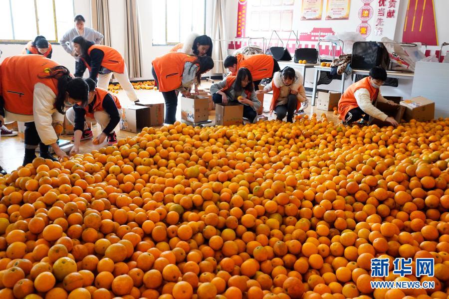 11月29日,在重庆市北碚区东阳街道桃花山村,志愿者将柑橘装箱。