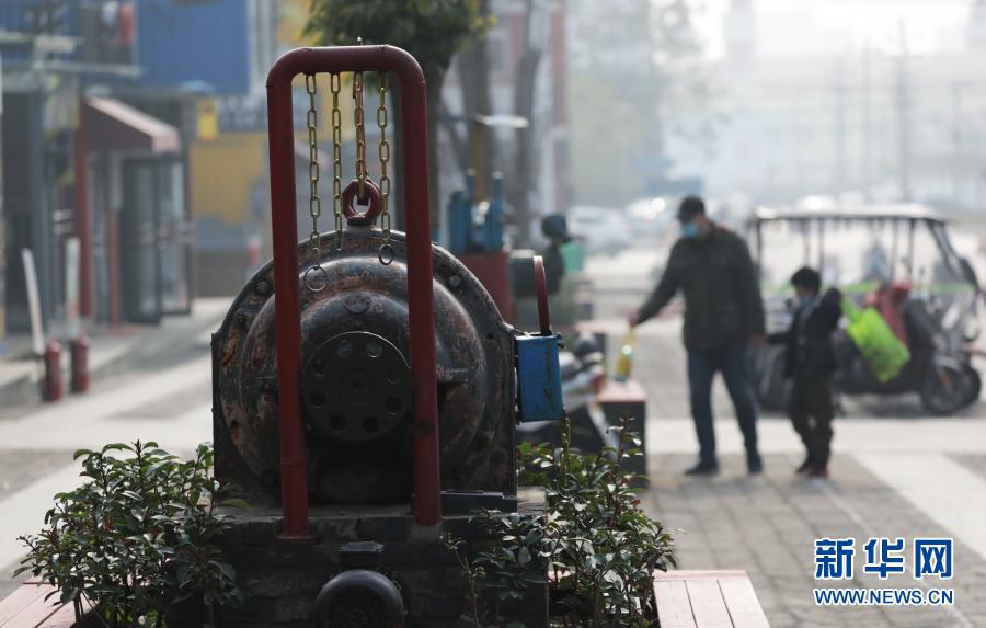11月29日,在河南省焦作市中站区王封矿“西大井1919”特色商业街,游客在观看由废旧煤矿设备改造成的文创作品。