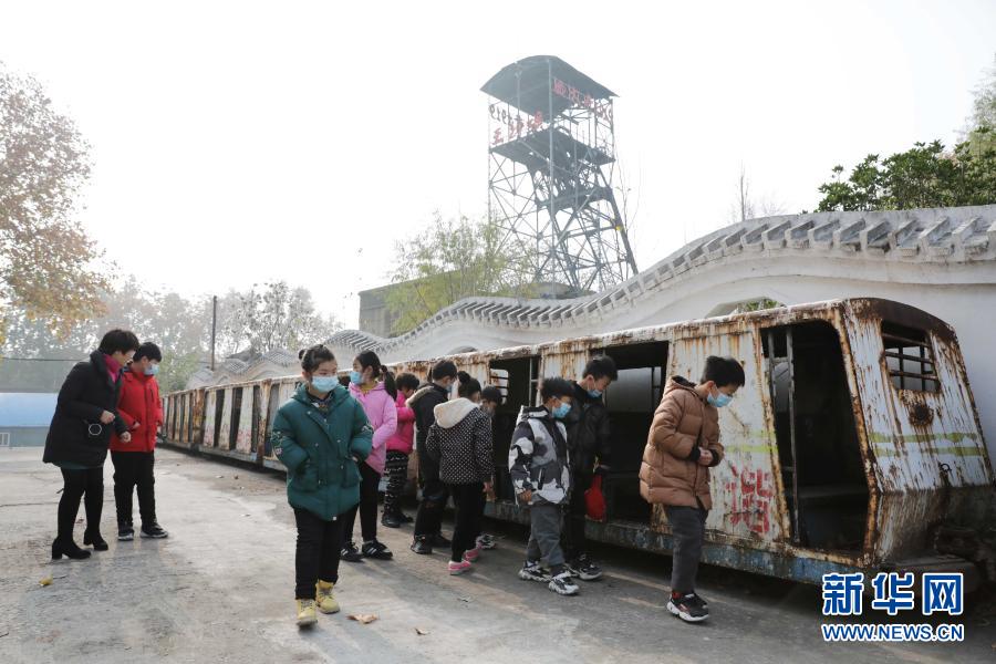 11月29日,在河南省焦作市中站区王封矿,游客在参观矿车。