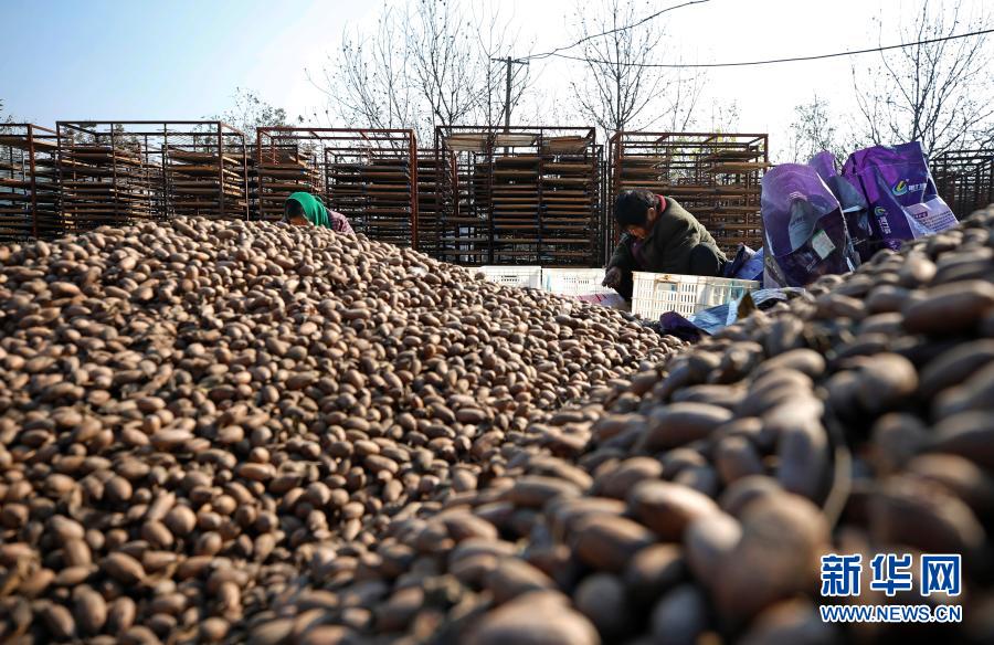 11月29日,泗洪县双沟镇果农在晒场分拣薄壳山核桃。