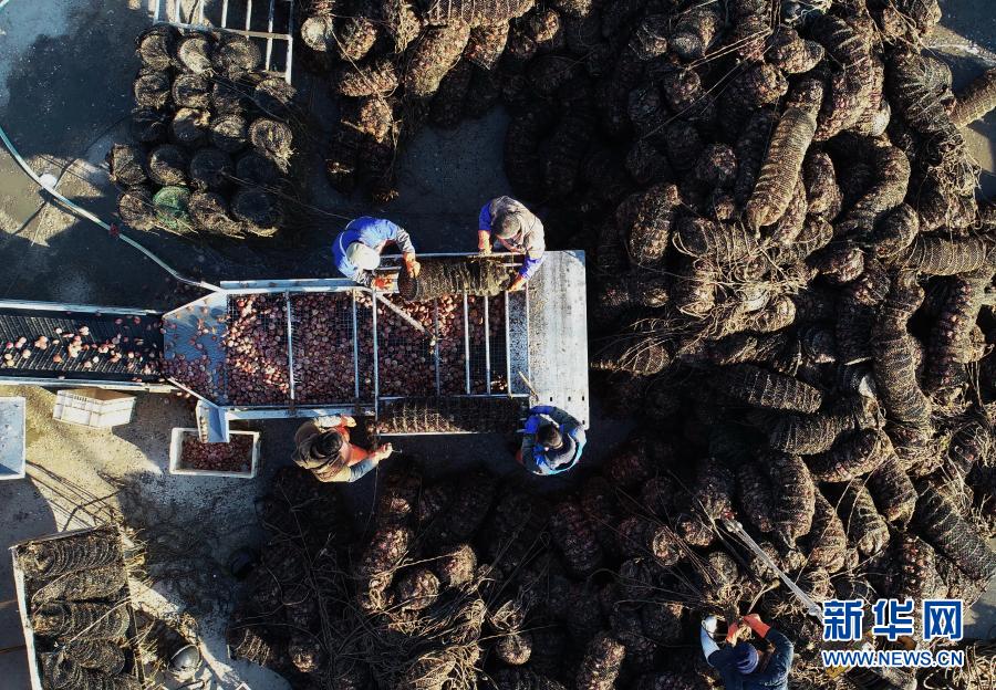 11月30日,乐亭县姜各庄镇南海滨村农民将收获的扇贝倒出养殖笼,进行清洗(无人机照片)。