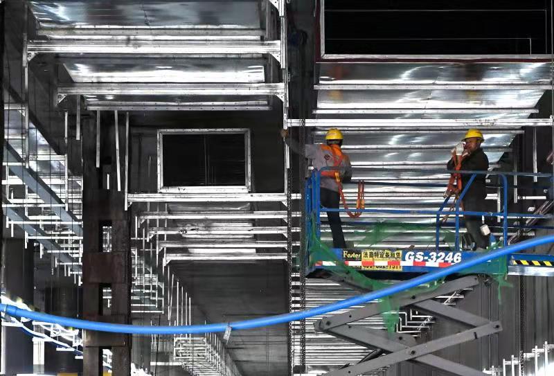 12月1日,工人在广州地铁18号线番禺广场站换乘大厅施工。