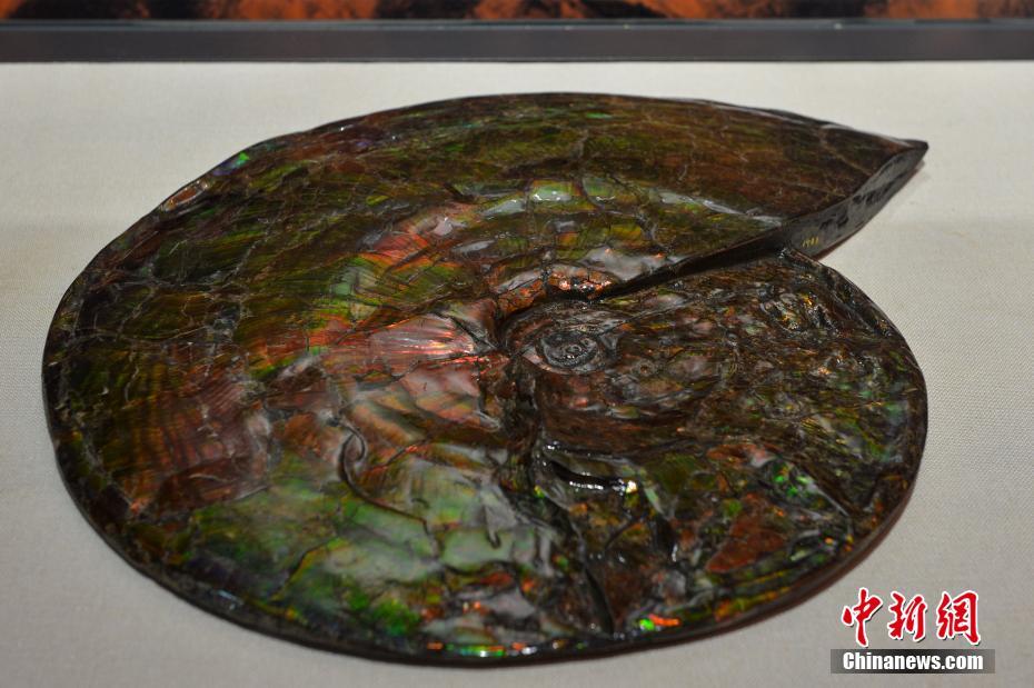 12月1日,“生命之美”公益展在北京自然博物馆开展,共展出标本399件。图为展出的斑彩螺化石。中新社记者 田雨昊 摄