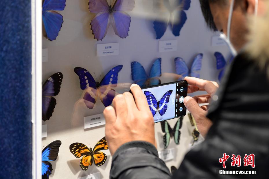 12月1日,“生命之美”公益展在北京自然博物馆开展,共展出标本399件。图为参观者拍摄蝴蝶标本。中新社记者 田雨昊 摄