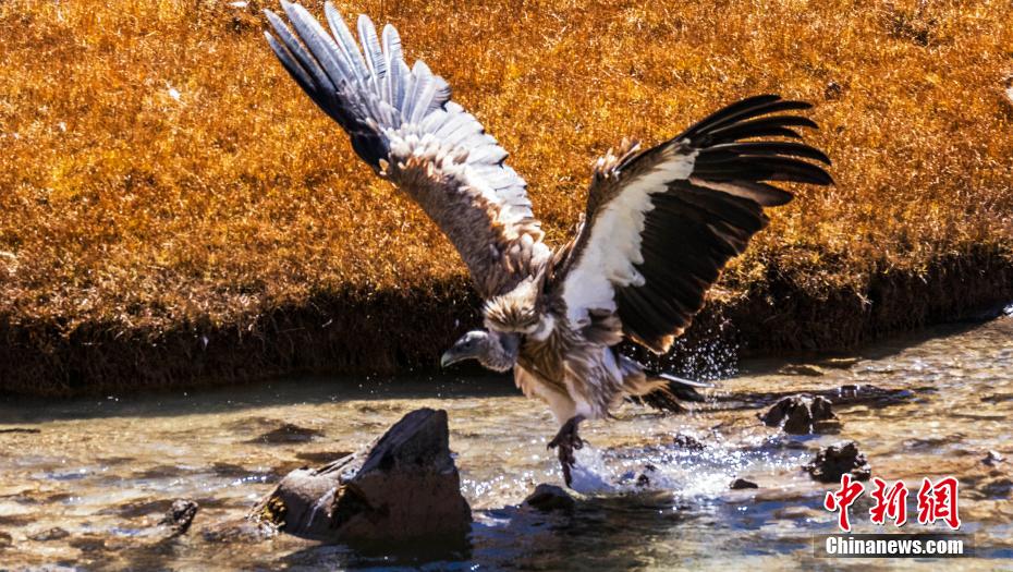 隆冬时节,摄影爱好者在澜沧江源头的青海省玉树州杂多县扎青乡境内布当河中,抓拍到数十只高山兀鹫在布当河里进食。因主要以腐肉为食,高山兀鹫有着“草原清道夫”的绰号。图为高山兀鹫在河面上飞舞。 文/孙睿 图/功霸扎西达杰