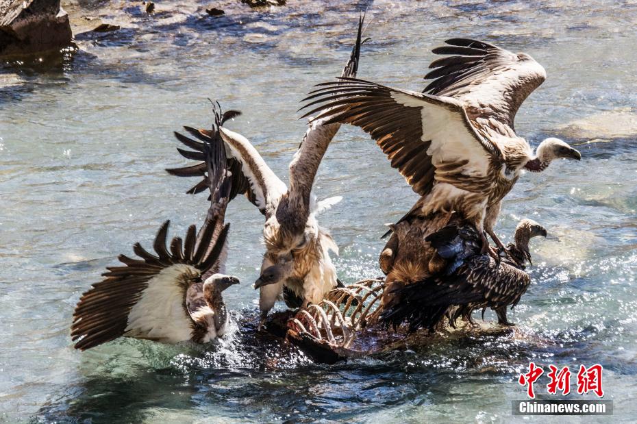 图为四只高山兀鹫在河中一边抢食,一边喂食。 文/孙睿 图/功霸扎西达杰
