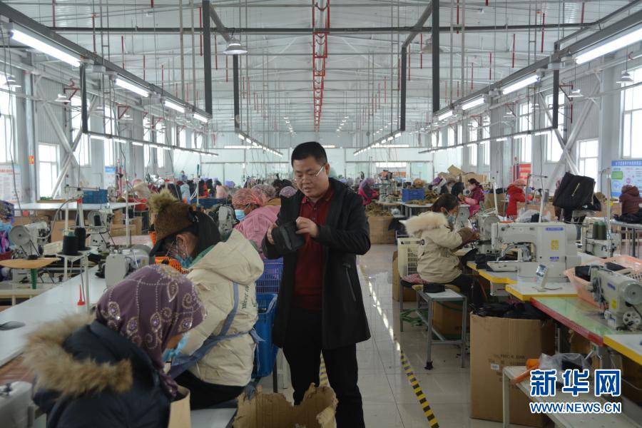 12月5日,在固原市泾源县的泉祥户外纺织扶贫车间内,企业负责人黄水海在随机抽检产品质量。新华社记者 颜之宏 摄