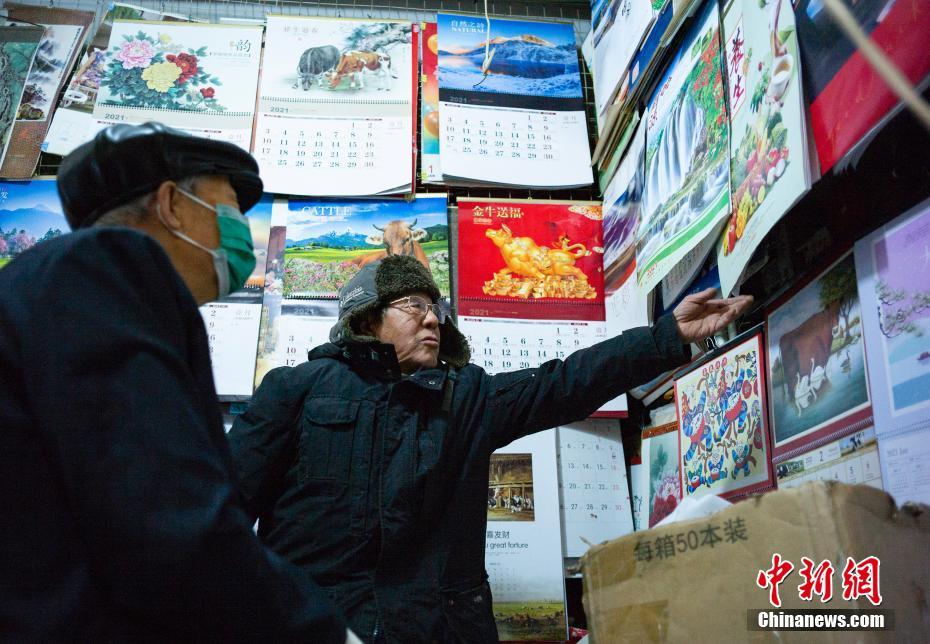 12月8日,金安光大爷(右)在位于北京市西黄城根北街的挂历店内为顾客介绍挂历。年逾古稀的金大爷在此经营着一间不足20平米的挂历小店,近40年来一直坚持出售各式纸质挂历,逐渐成为北京人关于挂历情怀的寄托,被不少老顾客称为“北京最后的挂历店”。中新社记者 侯宇 摄