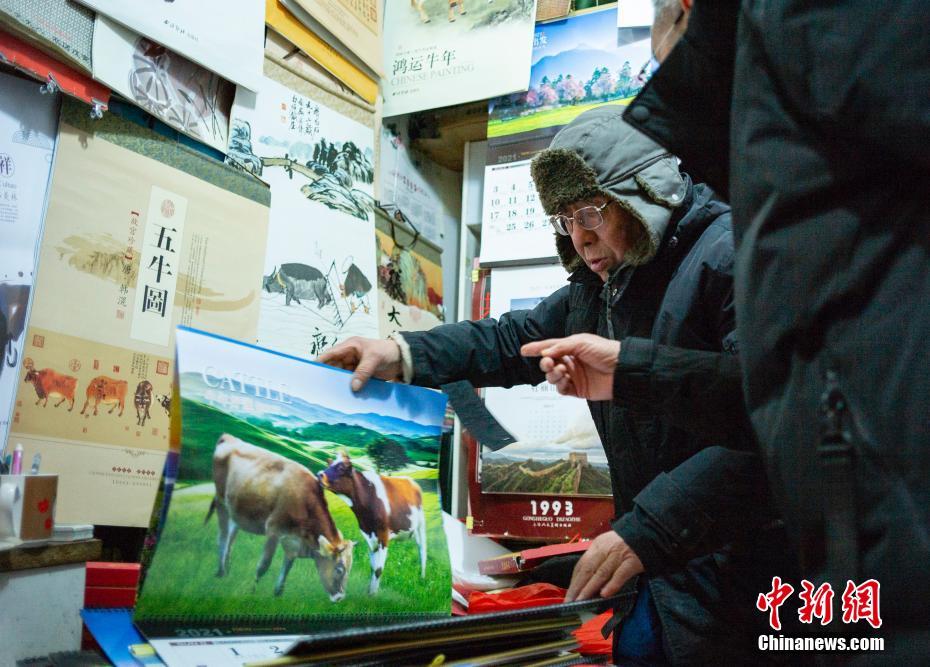 12月8日,金安光大爷(左)在位于北京市西黄城根北街的挂历店内为顾客介绍牛年挂历。中新社记者 侯宇 摄