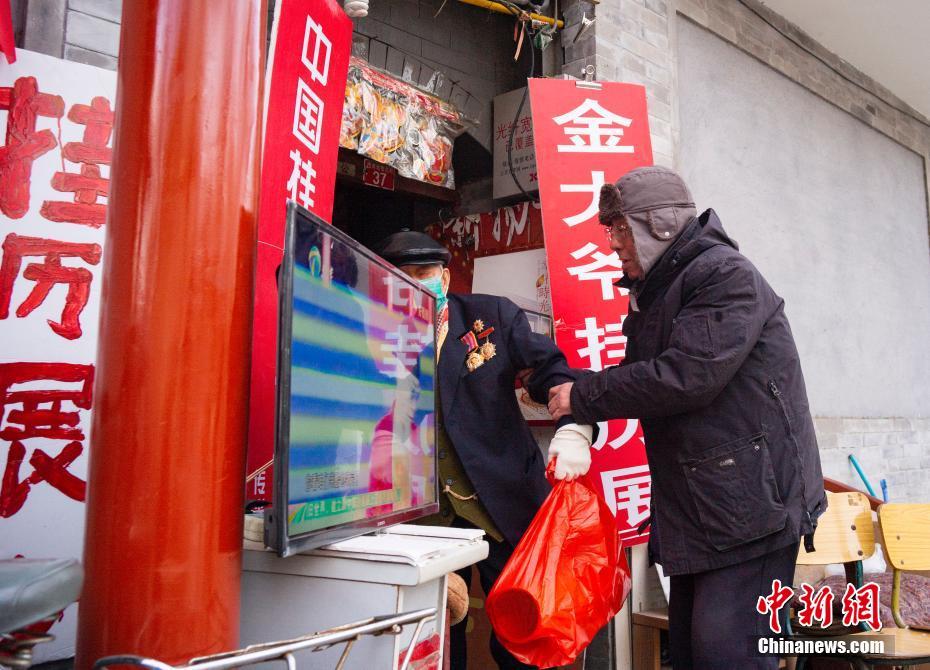 12月8日,金安光大爷(右)搀扶着一位老顾客离开位于北京市西黄城根北街的挂历店。中新社记者 侯宇 摄