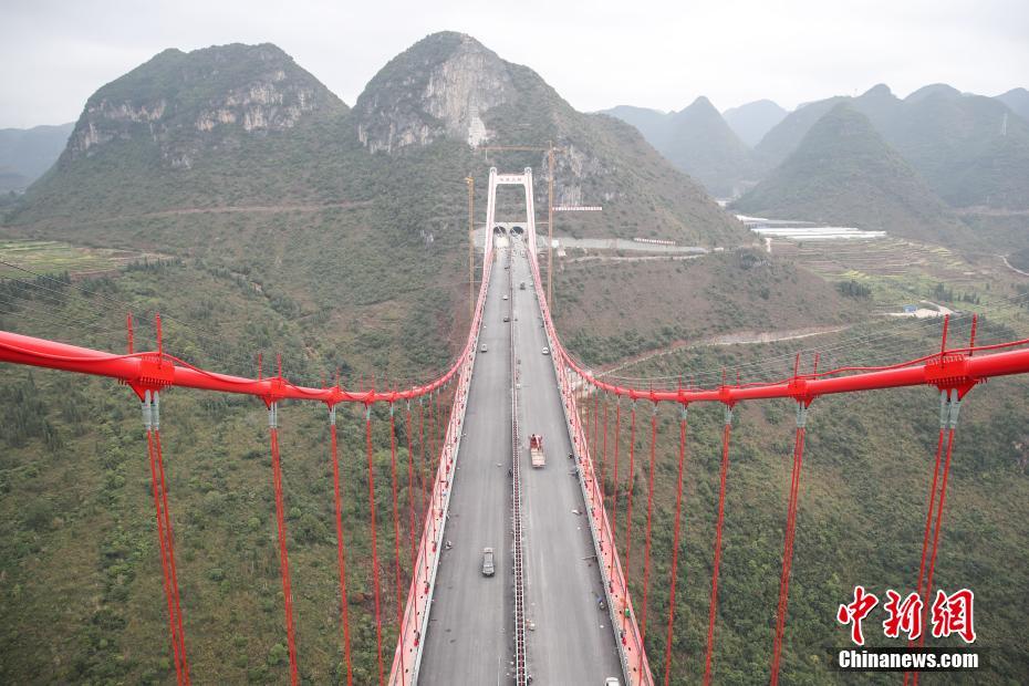 12月9日,贵州省黔西南布依族苗族自治州兴义环城高速公路控制性工程峰林特大桥建设项目上,工人抢抓工期进行尾期建设工作,以确保大桥12月底能够如期通车。中新社记者 瞿宏伦 摄
