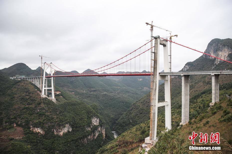 峰林特大桥是兴义环高项目上的特大桥之一,全长1163米,主跨采用550米悬索桥,桥面离谷底364.2米,是中国山区第一座大跨径钢混叠合梁悬索桥。中新社记者 瞿宏伦 摄