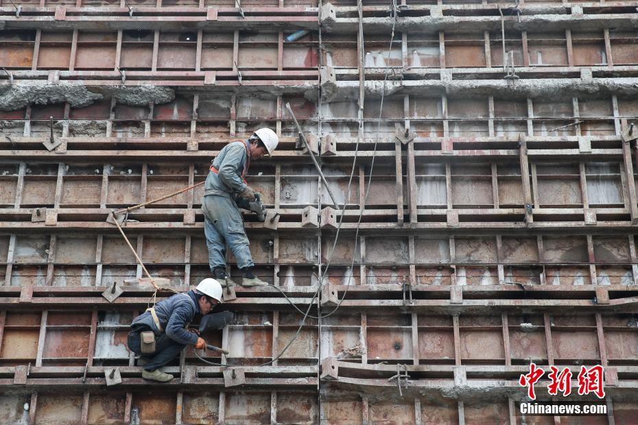 图为两名工人在拆除大桥隧道锚偏压墙模板。中新社记者 瞿宏伦 摄