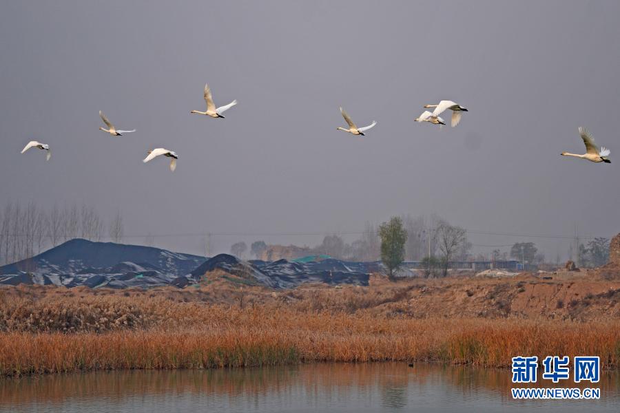 12月9日,天鹅在下解村的湿地上空飞舞。新华社记者 牟宇 摄