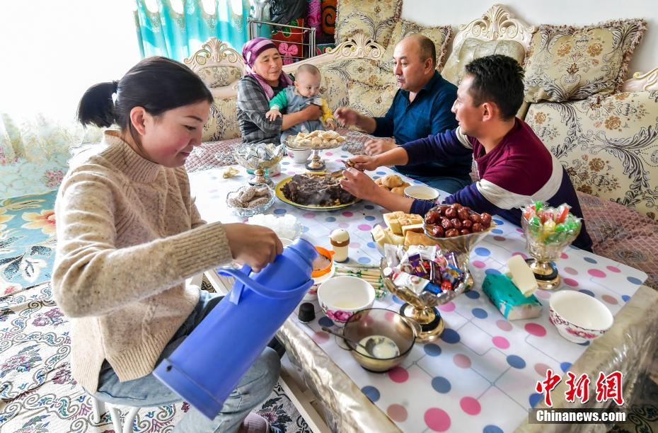12月9日,新疆阿勒泰地区青河县阿格达拉镇,在家照顾孙子的热合买提汗·木尼亚提(右二),与妻子阿依古丽·再达(左二),儿子叶尔森别克·热合买提汗(右一),儿媳古丽古丽·马德尼亚提(左一)一起吃午饭。热合买提汗·木尼亚提家有3人在外工作,如今他家的家庭年收入已有8万元人民币,生活质量得到了大幅提升。中新社记者 刘新 摄