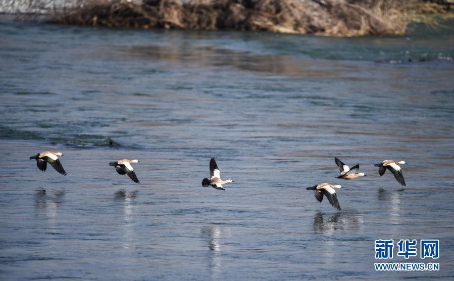 12月11日,赤麻鸭在千姿湖湿地公园飞翔。冬日时节,位于黄河上游的青海省海南藏族自治州贵德县境内的千姿湖湿地公园风景如画。新华社记者 吴刚 摄