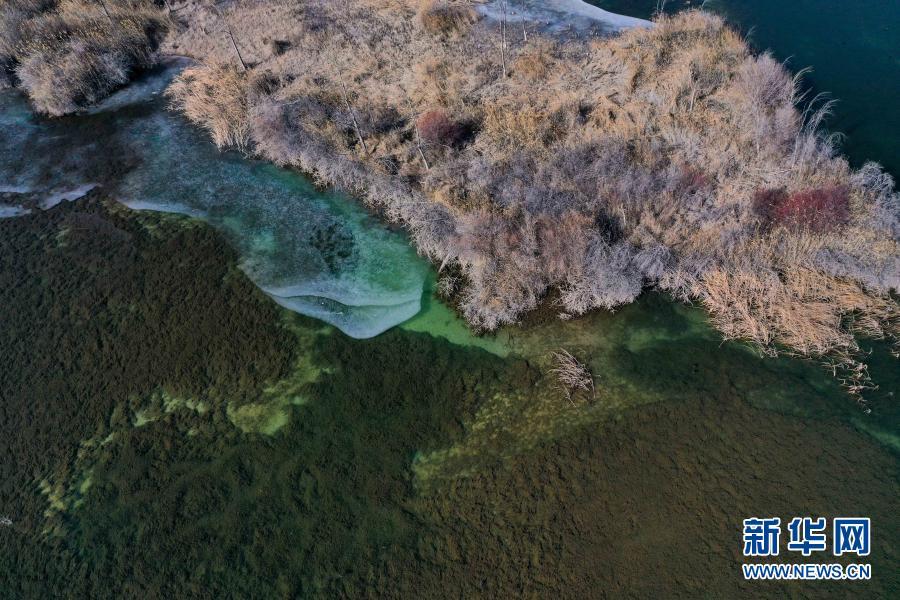 这是12月11日拍摄的千姿湖湿地公园景色(无人机照片)。冬日时节,位于黄河上游的青海省海南藏族自治州贵德县境内的千姿湖湿地公园风景如画。新华社记者 吴刚 摄