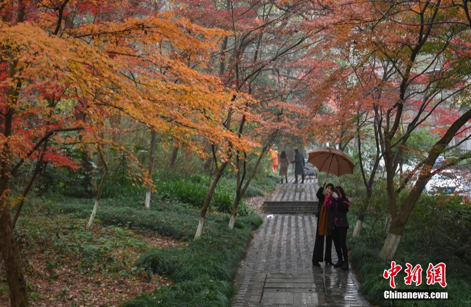 12月11日,浙江杭州,游客在枫树下驻足拍照。近日,浙江杭州西湖景区灵隐路两侧的红枫等植物树叶渐红,绵延数公里的冬日“枫”景吸引市民游客前来观赏。中新社记者 王刚 摄