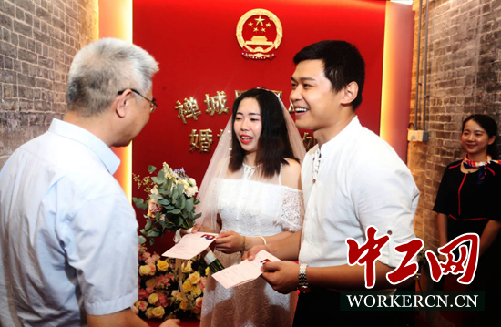 中工网讯 5月20日,在古色古香的岭南天地特约结婚登记点,霍嘉琪和刘云从佛山市民政局局长梁志光手中接过结婚证,成为当日第一对完成结婚登记的新人。他们相识于2018年一场联谊活动,活动由佛山市总工会、佛山市民政局双拥办及佛山市军分区共同举办。今年5月20日,他们迈入了婚姻的殿堂。