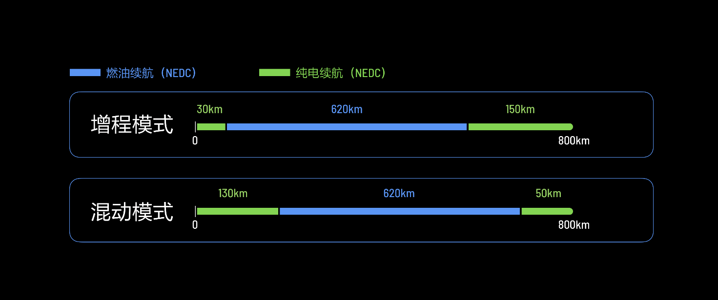 增程模式下,理想ONE优先使用电池行驶150公里(NEDC工况),之后增程器启动并提供620公里(NEDC工况)的燃油发电里程。燃油耗完之后,仍然剩余30公里的安全电池续航,适合有家庭充电桩的用户,用户可享受极低的能源成本;混动模式下,增程发电系统在纯电行驶50公里后开始工作,燃油耗完之后,剩余130公里的充沛电池续航,更加适合无家庭充电桩的用户,能源补给方便。增程发电系统和电池组之间的协同工作,可避免电池组过充过放,保证电池组的安全和寿命。