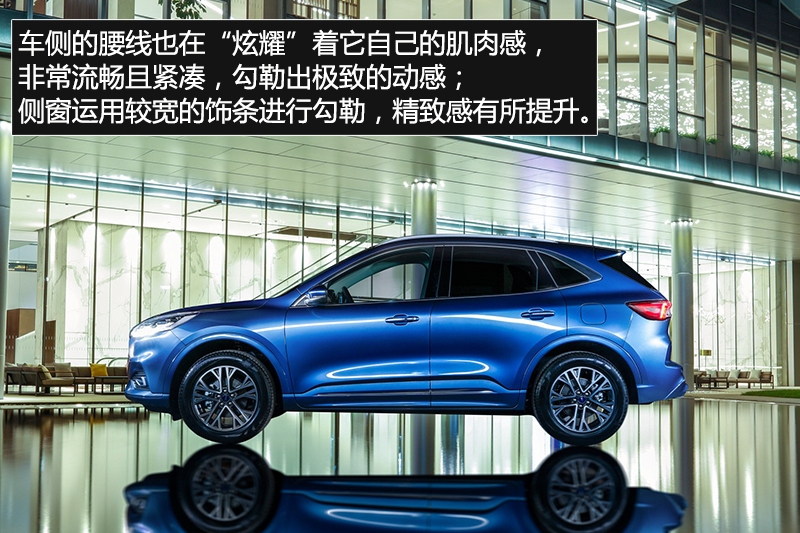 首先,全新福特锐际针对中国消费者喜好而全新设计了前脸造型,更加满足中国消费者对大气设计的喜好。具体设计层面,整体采用了静谧水滴造型的设计,将“水滴型流动曲面”展现的淋漓尽致,仔细观察会发现它的车头会比同级车型都要低,一在视觉上可以营造更强的战斗感,二在功能上则可以做到降低风阻。