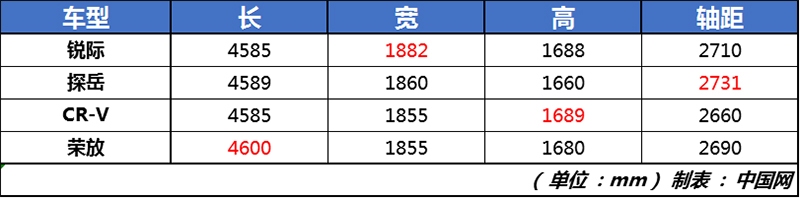 通过上图可以看出,锐际的车身尺寸在同级主流车型中属于上游水平,1882mm的车身宽度与竞品相比有着明显的优势,在车内可以带来更好的横向乘坐空间,再加上表现不错的1688mm车身高度以及在同级处于领先水平的2710mm轴距,后排的乘坐空间是无需留有顾虑的。