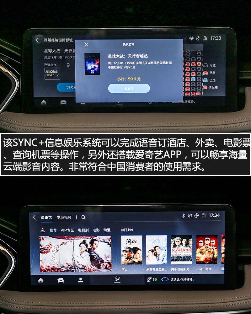 最令人感到新意的是该SYNC+信息娱乐系统可以完成语音订酒店、外卖、电影票、查询机票等操作,而且用户体验很棒。很显然,这是福特针对中国市场进行有针对性的产品开发的结果,真正做到了产品的本土化,在很多务实上落地,而非仅仅只是单纯的一件商品。不得不说,在照顾中国消费者使用需求的层面,锐际所搭载的这套SYNC+信息娱乐系统确实在同级车型中具备很大优势。