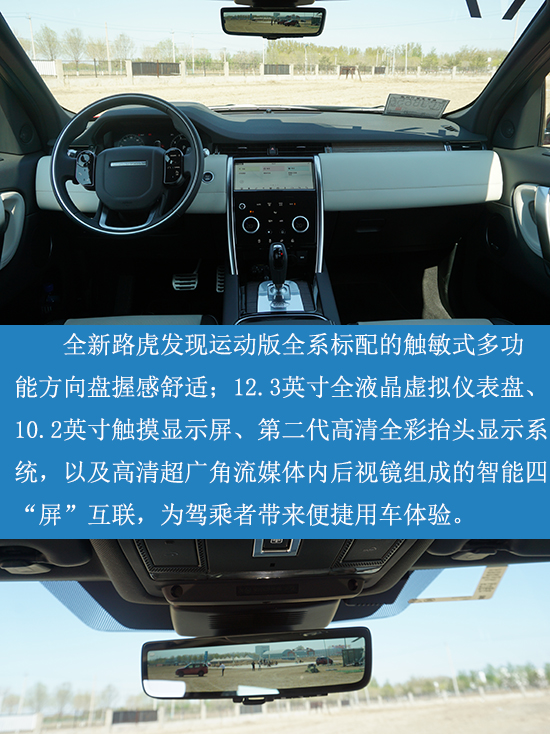进入车内,全新路虎发现运动版全系标配的触敏式多功能方向盘握感舒适;12.3英寸全液晶虚拟仪表盘、10.2英寸高分辨率触摸显示屏、第二代高清全彩抬头显示系统,以及高清超广角流媒体内后视镜组成的智能四“屏”互联,为驾乘者带来便捷用车体验;几乎所有乘员触及之处均采用优质的软性材料包裏,质感迎面而来。