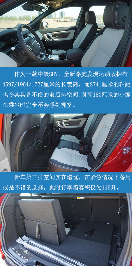 作为一款中级SUV,全新路虎发现运动版拥有4597/1904/1727厘米的长宽高,而2741厘米的轴距也令其具备不俗的前后排空间,身高180厘米的小编在乘坐时完全不会感到拥挤。不过,新车第三排的空间实在堪忧,在紧急情况下备用或是不错的选择,此时行李箱容积仅为115升。