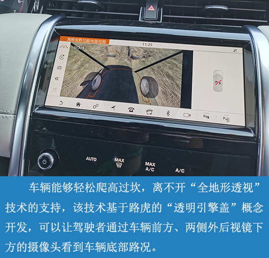 车辆能够轻松爬高过坎,同样离不开全地形“透视”技术的支持。该技术基于路虎的“透明引擎盖”概念开发,可以让驾驶者通过车辆前方、两侧外后视镜下方的摄像头看到车辆底部路况,从而解决了全地形驾驶的最后一个视觉死角。