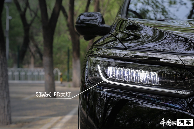 此外,logo处中网的位置比两侧大灯的位置更突出,再结合狭长的造型以及内部羽翼式的灯腔,整体造成了大灯给人眼眸深邃的感觉。