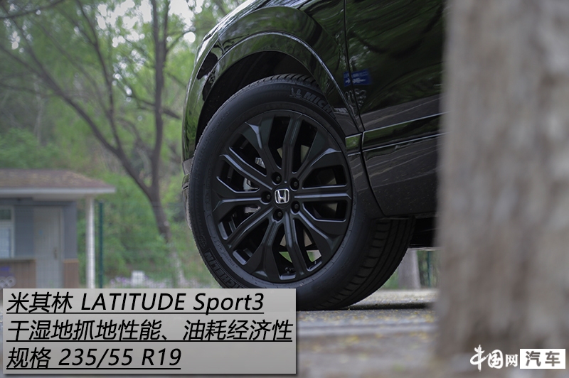 试驾车型采用了19英寸熏黑色轮圈,有效的提升了运动效果,轮胎配的是米其林 LATITUDE Sport3轮胎,尺寸为235/55 R19,比较注重干湿地的抓地性能,同时还比较能兼顾到油耗经济性。