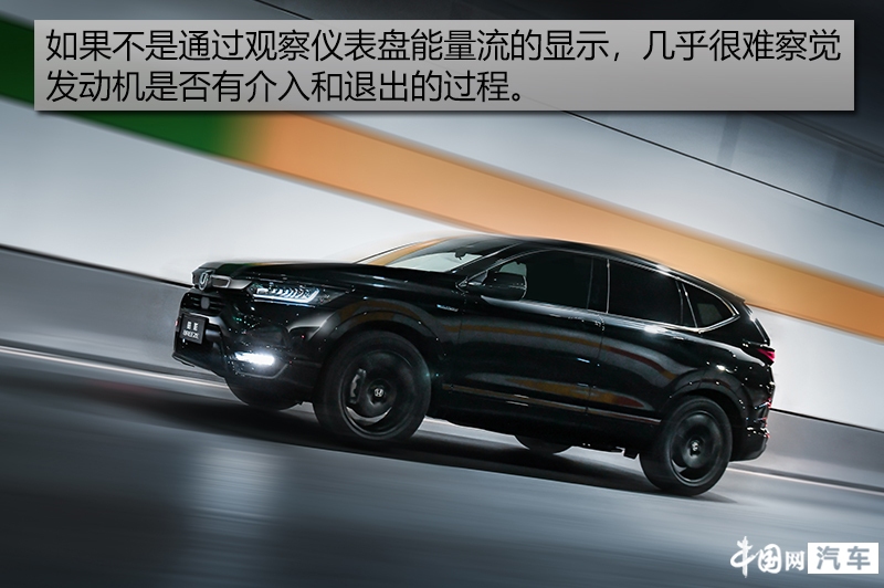 随着油门的逐渐深踩,混动模式也逐渐开启,但此时如果不是通过观察仪表盘能量流的显示,几乎很难察觉发动机是否有介入和退出的过程,而且在试驾过程中,我有刻意去感受发动机是否介入,体感层面确实未感受到振动等情况发生。