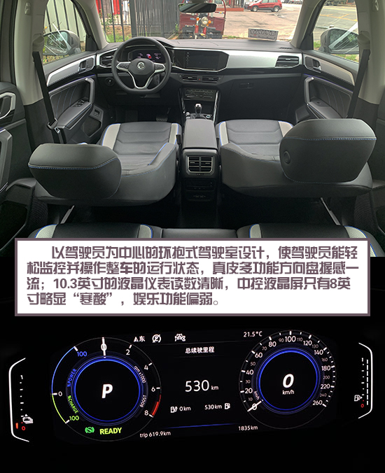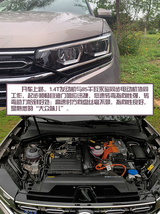 开车上路,1.4T发动机与85千瓦永磁同步电动机协同工作,起步顺畅且油门响应迅捷,低速转弯指向性强,转弯助力恰到好处;高速时方向盘丝毫不飘,指向性良好,是熟悉的“大众味儿”。