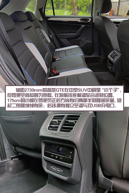 空间方面,轴距2730mm的探岳GTE在中型SUV中算是“小个子”,但驾乘空间却颇为宽敞,在将前排座椅调至合适的驾驶姿势的情况下,175cm的小编在驾驶员正后方尚有约两拳半的腿部余量,翘起二郎腿绰绰有余;后排独立空调与双USB充电口,则为后排乘客的提供了舒适性与便利性。