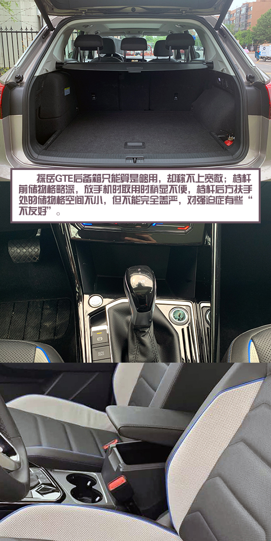 储物空间方面,探岳GTE后备箱只能算是够用,却称不上宽敞;档杆前储物格略深,放手机时取用时稍显不便,档杆后方扶手处的储物格空间不小,但不能完全盖严,对强迫症有些“不友好”。