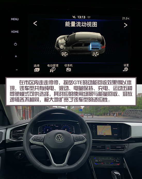 在市区内走走停停,探岳GTE的动能回收效果得以体现,该车型共有纯电、混动、电量保持、充电、运动五种驾驶模式可供选择,其对应的使用场景与能量回收、释放逻辑各不相同,极大地扩宽了该车型的适应性。值得一提的是,探岳GTE的动能回收相当顺滑,丝毫没有一般电动车或混动车的突兀感,如春雨般悄然而至,润物无声。