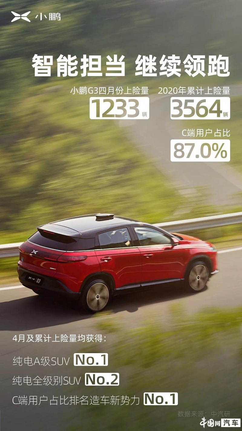 此外,小鹏G3在4月份及累计上险量均取得纯电A级SUV市场第一、纯电全级别SUV市场第二、C端用户占比在造车新势力中排名第一的成绩。