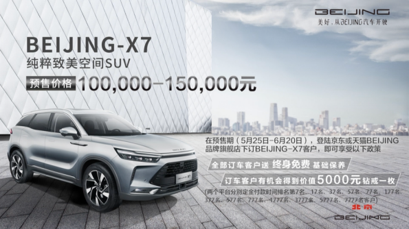 5月25日,BEIJING-X7“纯粹致美探索日”探秘之旅,在全网100余平台完成云端直播。北京汽车蓝谷营销服务有限公司总经理李一秀宣布BEIJING-X7全面开始接受预订,预售价格为10-15万元,预售政策包含终身免费保养和订车得钻戒等。