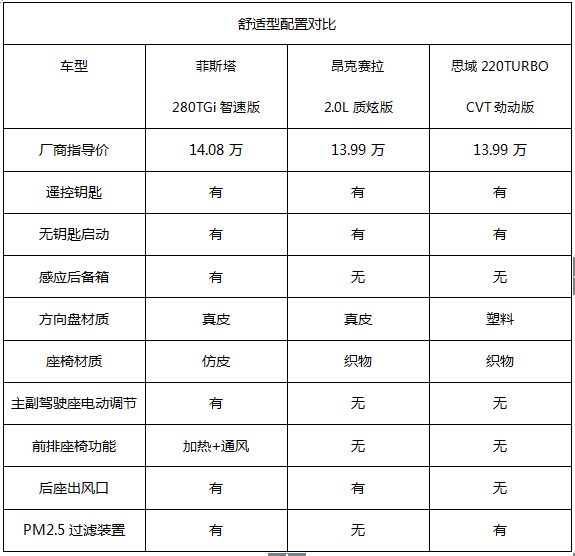 进入盛夏,在高气温的环境下开车容易疲劳,使驾驶员的注意力降低,产生安全隐患。如果车辆配备了便捷的智能操作与安全系统,无疑会减轻驾车疲劳感,大大降低行车风险。下面,我们就以思域220TURBO CVT劲动版(厂商指导价13.99万)、昂克赛拉新增的2.0L质炫版(厂商指导价13.99万)、菲斯塔280TGi智速版(厂商指导价14.08万)为例,比较一下谁才是安全最优选。