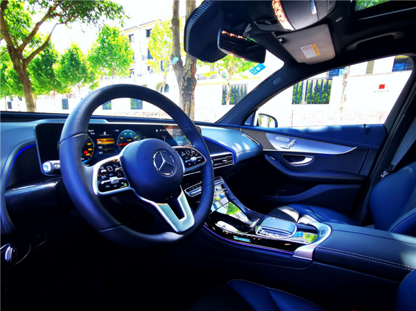 在驾驶辅助方面,EQC的智能驾驶辅助系统主要由定速巡航、车道偏离、自适应巡航三个部分组成。通过向下拨动方向盘上左侧区域的旋钮即可开始自适应巡航,并且可以调整跟车距离。在开启自适应巡航的状态下,使用转向灯时系统会自动完成并线动作,整体系统使用简单,在日常跑高速的情况下非常实用。奔驰EQC整体给人感觉非常容易上手,车辆整体调教接近奔驰燃油车,同时又具有电动车的特性,动力响应较燃油车更快速,行驶质感良好。