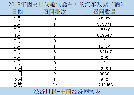 2018年,共有26批次、涉及1748463辆汽车因装配了“高田问题气囊”而被召回,占召回总量的14.19%。并且除了5月和9月,其余十个月都有相关召回产生,可见“高田问题气囊”影响之深。对此,全国乘联会秘书长崔东树也表示,高田气囊事件在全球是一起恶性的产品质量问题事件,且其影响远未消退。