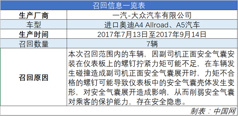 日前,一汽-大众向国家市场监督管理总局备案了召回计划,将自2019年2月1日起,召回2017年7月13日至2017年9月14日生产的2辆进口奥迪A4 Allroad汽车、2017年6月7日至2018年5月17日生产的5辆进口奥迪A5汽车,共计7辆。