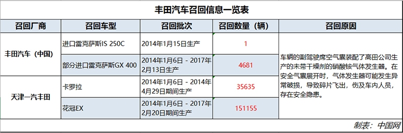 据国家市场监督管理总局1月29日公告,丰田汽车(中国)和天津一汽丰田将召回部分副驾驶席空气囊装配了高田公司生产的未带干燥剂的硝酸铵气体发生器的车辆,共涉及191472辆。