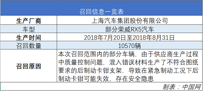 日前,上海汽车集团股份有限公司向国家市场监督管理总局备案了召回计划,决定自即日起,召回2018年7月20日至2018年8月31日期间生产的部分荣威RX5汽车,共计10570辆。