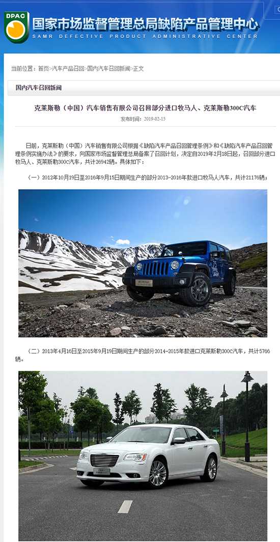 近日,克莱斯勒(中国)汽车销售有限公司发布公告,决定自2019年2月18日起,召回共计26942辆汽车,其中包括21176辆进口牧马人汽车和5766辆300C汽车。