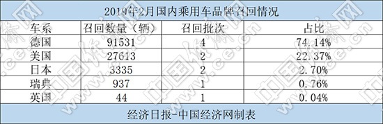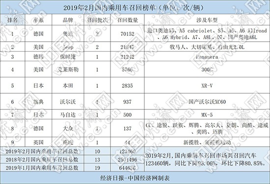 根据国家市场监督管理总局缺陷产品管理中心2月发布的召回公告,经济日报-中国经济网汽车频道经过汇总、统计,整理出“2019年2月国内乘用车召回榜单”。2月,国内乘用车市场共有9个品牌累计发布10起公告,共计召回汽车123460辆,同比下降95.06%,环比下降80.85%。